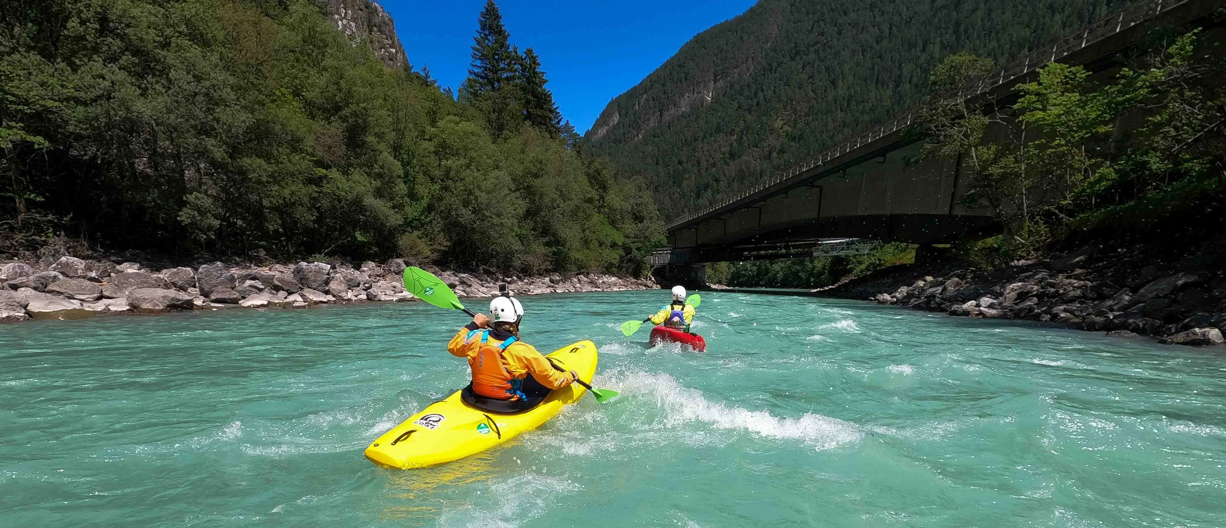 ist ebenso einer unserer Lieblingsflüsse. Bekannt ist er eigentlich für seine grossen Wellen und wuchtiges Wildwasser, aber wir kennen auch die ruhigeren Strecken am Inn, welche perfekt für unseren Anfängerkurs passen.