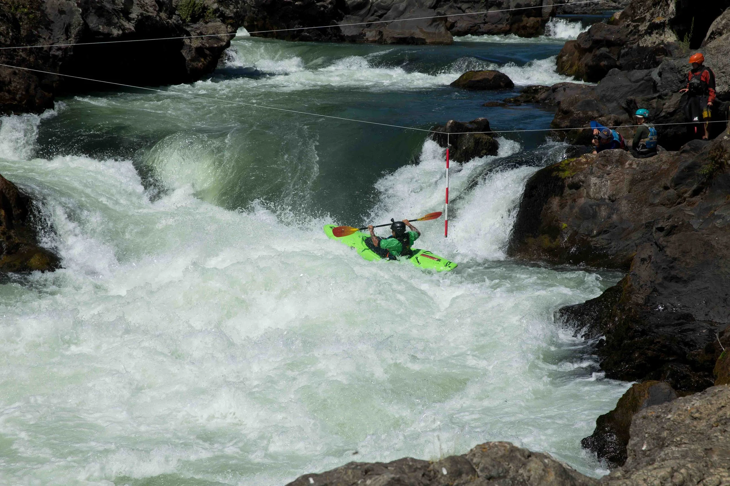 The second day saw me meet up with Santi and head to the Mariman Waterfall. The organising team were just getting ready to set up the course and it was certainly taking a different format than previous years! It was decided that rather than just having a downriver race on the rapid, instead there was going to be an extreme slalom with 2 gates placed at 2 extremely difficult eddies. The idea was to enter the first part, work to river right and make the gate on the far right in an extremely tight and boily eddy. Next followed a tricky move back into the main current through a hole while working hard left into a very unpredictable eddy where the stern of the kayak could get caught and flip you over as the returning current of the eddy was taking you up to the hole that was formed by a 2 metre drop. Once you had negotiated this gate, you need to cross the main current (which was pushing you back to river left and a horrible manky drop) to get to lip of the big drop and the final gate. Avoid the gate, boof to keep the bow free and clean while keeping hold of your paddle and not letting that cheeky rock underwater grabbing your blade, before a final sprint over the pool below. This was not an easy thing to achieve but as Santi liked to say: it is the Mariman Extreme event and you need to up your game. Judging by some of the faces of the competitors scouting the line and course you could see it was not going to be easy!