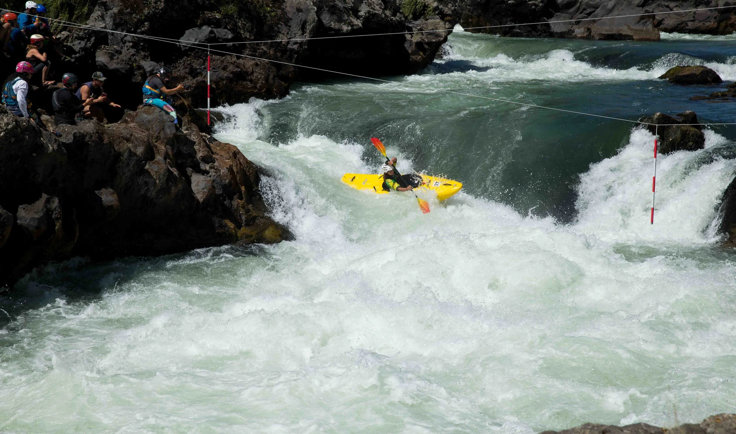 As each competitor dropped in for their run, you could see that the first gate was manageable and the line could be held. However, the second gate was proving to be very unpredictable. Everyones stern was getting caught on the entrance and then it was a question of where the boils were sending you. If you flipped, you were going to the hole at the bottom of the drop, if you made it upright you were trying to get to the only piece of green water in the eddy to then turn the kayak, set the angle and make the gate. If you were really unlucky the boils pushed you further lower in the eddy, killing your speed and all but ending you chance of a podium finish - it truly was an Extreme Slalom and this was before the main waterfall!!